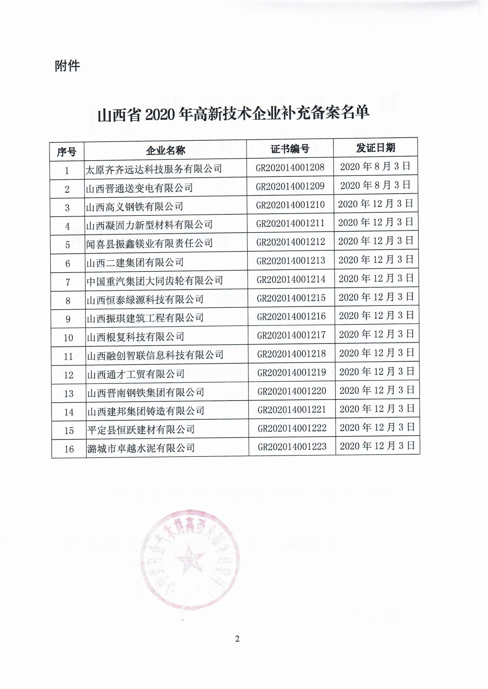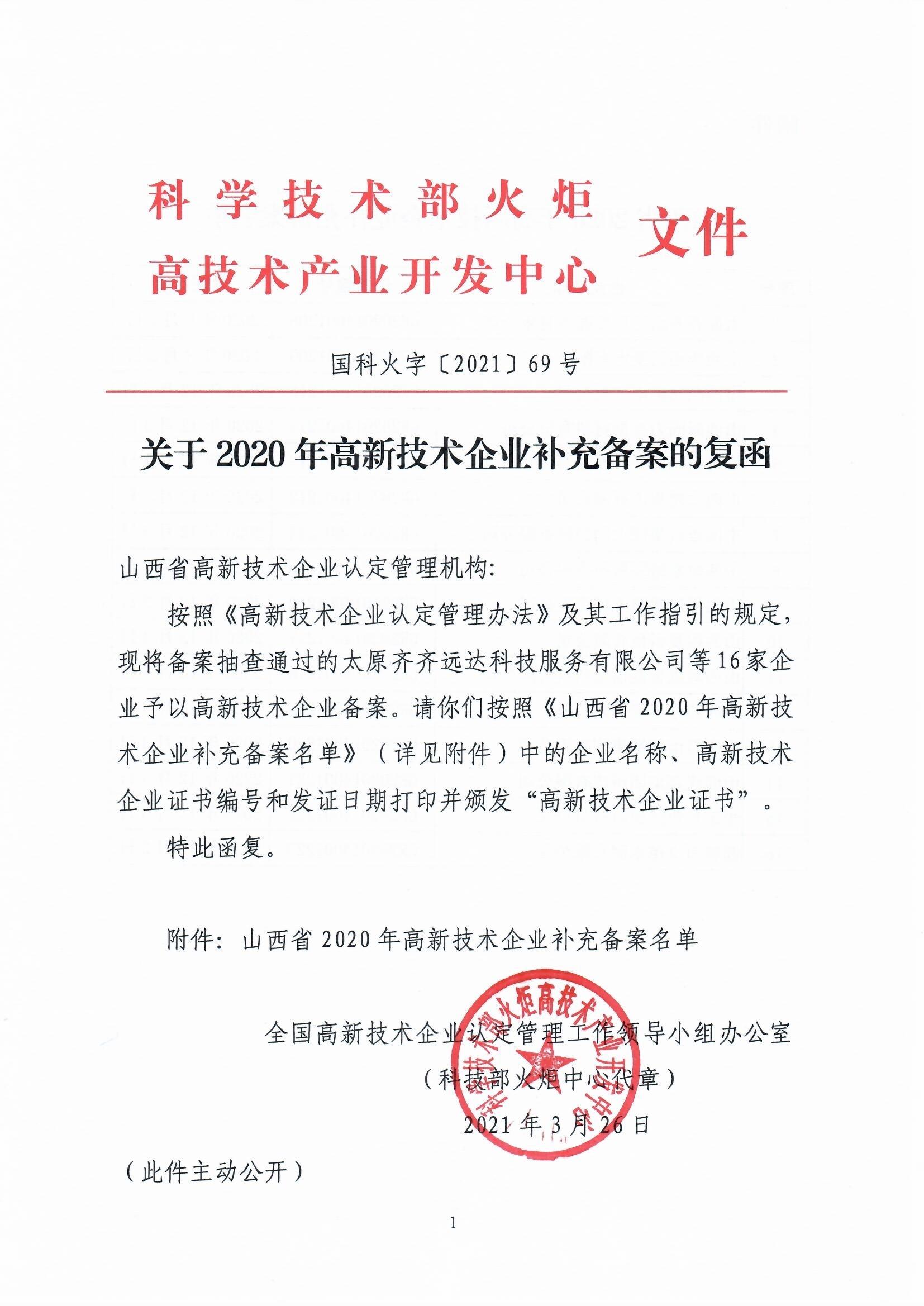 山西關(guān)于2020年高新技術(shù)企業(yè)補充備案的復函